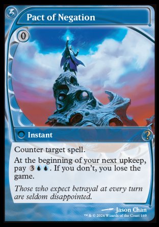 Le saviez-vous ? Les cinq cartes Intervention Pact, Pact of Negation, Slaughter Pact, Pact of the Titan et Summoner's Pact, de l'édition Future Sight, forment un cycle appelé "Pact". Leur mécanique a été inspirée par la mécanique Super Haste de la carte Rocket-Powered Turbo Slug. Selon Mark Rosewater, on retrouve un effet similaire à savoir : avoir un effet immédiat que l'on doit payer plus tard ou perdre la partie. |