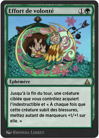 Jusqu'à la fin du tour, une créature ciblée que vous contrôlez acquiert l'indestructible (Les effets qui disent "détruisez" ne détruisent pas ce permanent. Une créature indestructible ne peut pas être détruite par des blessures.) et "À chaque fois que cette créature subit des blessures, mettez autant de marqueurs +1/+1 sur elle."