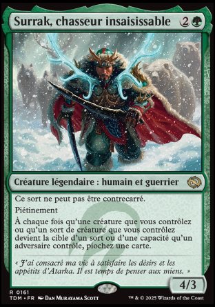 Le saviez-vous ? Les cinq cartes Anafenza, the Foremost, Narset, Enlightened Master, Sidisi, Brood Tyrant, Zurgo Helmsmasher et Surrak Dragonclaw, de l'édition Khans of Tarkir, forment un cycle de créatures légendaires tricolores, chacune représentant le khan de son clan. Au moment des événements de l'édition Tarkir: Dragonstorm, les khans des clans sont respectivement Felothar, Dawn of the Abzan, Narset, Jeskai Waymaster, Kotis, the Fangkeeper, Zurgo, Thunder's Decree et Eshki Dragonclaw ; les anciens khans Anafenza, Unyielding Lineage, Sidisi, Regent of the Mire et Surrak, Elusive Hunter ont une autre occupation au sein du clan. |
