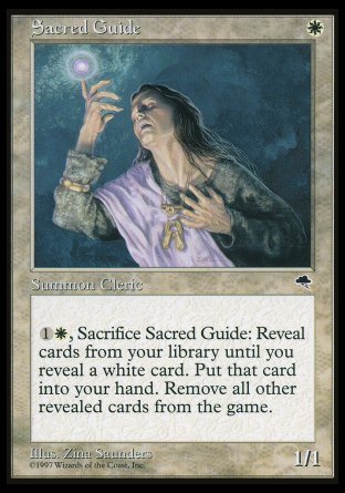 , sacrifiez le Guide sacré : Révélez les cartes de votre bibliothèque jusqu'à ce que vous révéliez une carte blanche. Mettez cette carte dans votre main et exilez toutes les autres cartes révélées de cette manière.