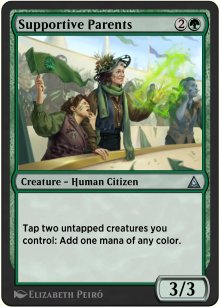 La carte Supportive Parents, de l'édition Through the Omenpaths, possède une illustration différente sur MTGO (toujours par la même artiste Elizabeth Peiró).