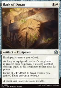 La carte Bark of Doran est une référence à Doran (the Siege Tower, Besieged by Time), de par son nom et la capacité qu'elle confère à la créature équipée.