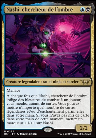 Le saviez-vous ? Nashi est l'un des nombreux enfants adoptifs de Tamiyo, the Moon Sage et de son compagnon. Le couple étant très ouvert, ils n'ont pas adopté que des orphelins Lunaréens, mais également des Humains et Nashi, le plus jeune, qui est un Nezumi. D'un tempérament rebelle, mais très proche de sa mère, il a d'abord rejoint le gang Okiba (voir cette anecdote), mais, à la mort de celle-ci, il choisira d'honorer sa mémoire et de poursuivre son œuvre. La carte Nashi, Moon's Legacy représente ainsi Nashi, Moon Sage's Scion, après la mort de sa mère adoptive : il a hérité des parchemins contenant les récits dont Tamiyo se servait pour lancer ses sorts, et d'un nouveau type de créature, Shamane, accompagné de deux nouvelles couleurs et qui sont les couleurs principales de Tamiyo, visibles par exemple sur Tamiyo, Collector of Tales ou Tamiyo, Seasoned Scholar.La carte Cathartic Parting représente les adieux qu'a enfin pu lui faire Nashi, Searcher in the Dark après cette séparation forcée. |