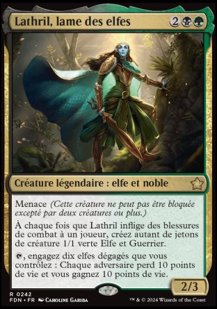 À chaque fois que Lathril inflige des blessures de combat à un joueur, créez autant de jetons de créature 1/1 verte Elfe et Guerrier.