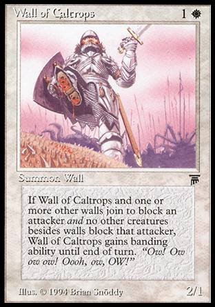 À chaque fois que le Wall of Caltrops bloque une créature, si au moins une autre créature mur bloque cette créature et qu'aucune créature non-mur ne bloque cette créature, le Wall of Caltrops acquiert le regroupement (N'importe quel nombre de créatures avec le regroupement, plus jusqu'à une créature sans le regroupement, peuvent attaquer en bande. Les bandes sont bloquées comme un groupe. Si des créatures avec le regroupement que vous contrôlez bloquent ou sont bloquées par une créature, vous divisez à la place de son contrôleur les blessures de combat de cette créature parmi les créatures qui la bloquent ou qu'elle bloque.) jusqu'à la fin du tour.