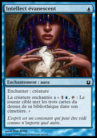 La créature enchantée a "   ,  : Le joueur ciblé meule (Pour meuler une carte, un joueur met la carte du dessus de sa bibliothèque dans son cimetière.) trois cartes."