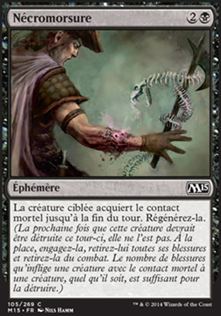 La créature ciblée acquiert le contact mortel (N'importe quel nombre de blessures que cette créature inflige à une créature est suffisant pour la détruire.) jusqu'à la fin du tour. Régénérez-la (La prochaine fois que ce permanent devrait être détruit ce tour-ci, il ne l'est pas. À la place, engagez-le, retirez-lui toutes ses blessures et retirez-le du combat.).