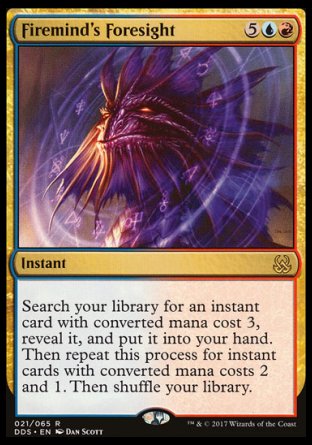 Cherchez dans votre bibliothèque une carte d'éphémère ayant une valeur de mana de 3, révélez-la et mettez-la dans votre main. Puis répétez ce processus pour les cartes d'éphémère ayant des valeurs de mana de 2 et 1. Puis mélangez.