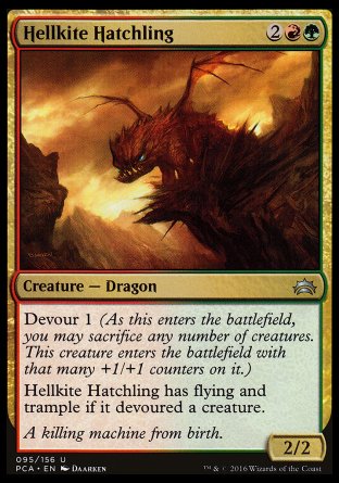 La Progéniture escouflenfer a le vol (Cette créature ne peut être bloquée que par des créatures avec le vol ou la portée.) et le piétinement (Cette créature peut infliger les blessures de combat en excès au joueur ou au planeswalker qu'elle attaque.) si elle a dévoré une créature.