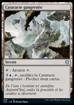 Les cartes Island et Blighted Cataract, de l'édition Battle for Zendikar et illustrées par Vincent Proce, montrent le même lieu de Zendikar, avant et après l'attaque des Eldrazis. En témoignent les "îles-vases" trouées, desquelles s'écoulent à présent de la poussière et des cendres.
