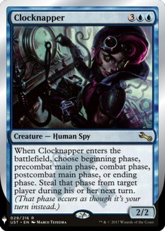When Clocknapper enters, choose beginning phase, precombat main phase, combat phase, postcombat main phase, or ending phase. Steal that phase from target player during their next turn. (That phase occurs as though it's your turn instead.)