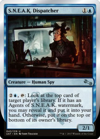 ,  : Look at the top card of target player's library. If it has an Agents of S.N.E.A.K. watermark, you may reveal it and put it into your hand. Otherwise, put it on the top or bottom of its owner's library.